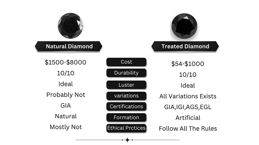 Enhanced black diamonds are significantly cheaper than natural ones. Additionally, their structure is less porous, often resulting in a smoother surface. Treated or lab-grown black diamonds offer the same appearance and quality as natural black diamonds but at a lower cost. These diamonds are certified by reputable institutions like IGI and GIA, ensuring proper evaluation of their color, clarity, carat, cut, and dimensions