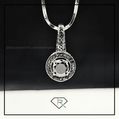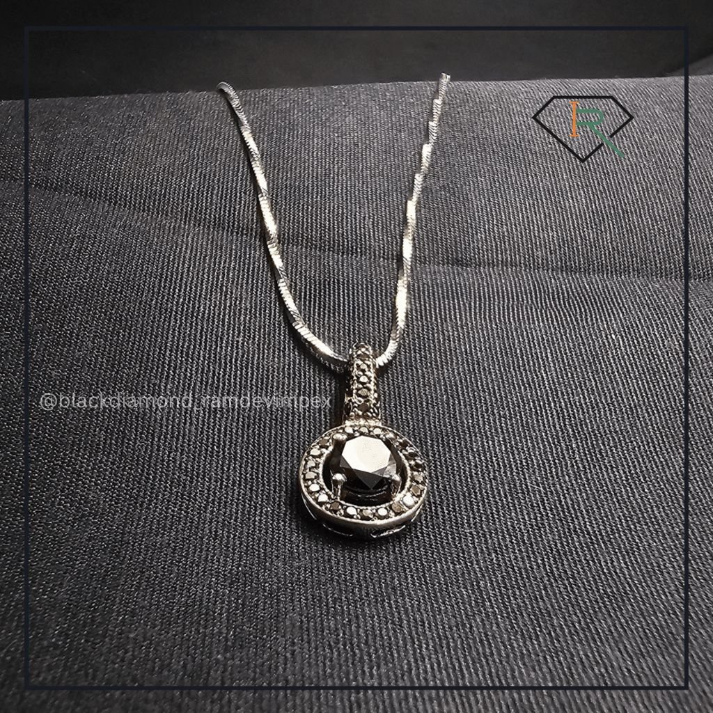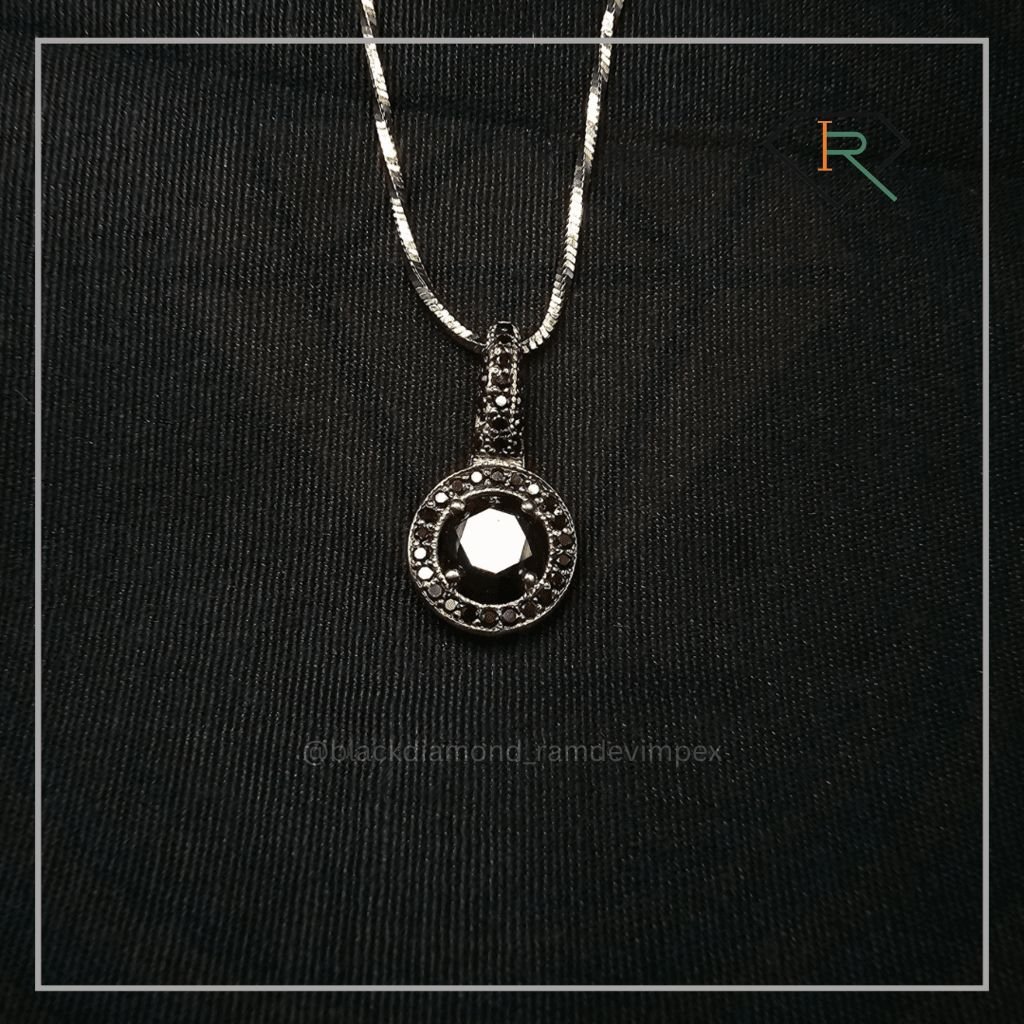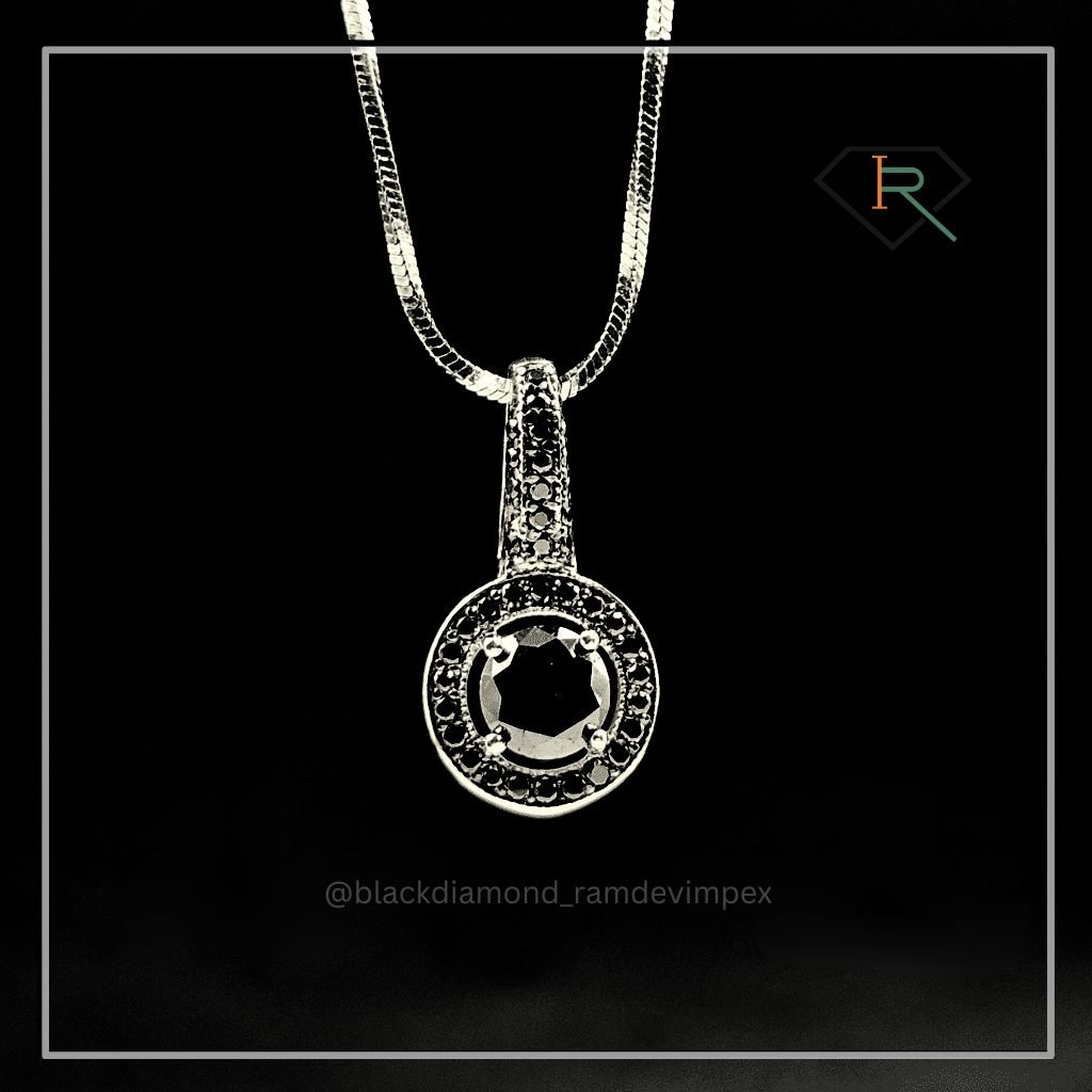"Experience sophistication with our Black Diamond Necklace. A central 1.22 CT. large black diamond surrounded by 0.20 CT. smaller diamonds, set in white gold. Elevate any look with its timeless elegance and glamour."