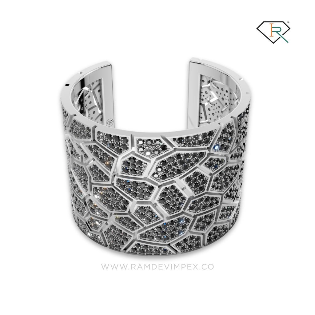 "This stunning silver cuff bracelet, weighing 148.54 grams, features bold black treated original diamonds in a round brilliance cut. Perfect for men and women, it combines edgy sophistication with timeless elegance"