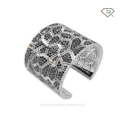 "This stunning silver cuff bracelet, weighing 148.54 grams, features bold black treated original diamonds in a round brilliance cut. Perfect for men and women, it combines edgy sophistication with timeless elegance"